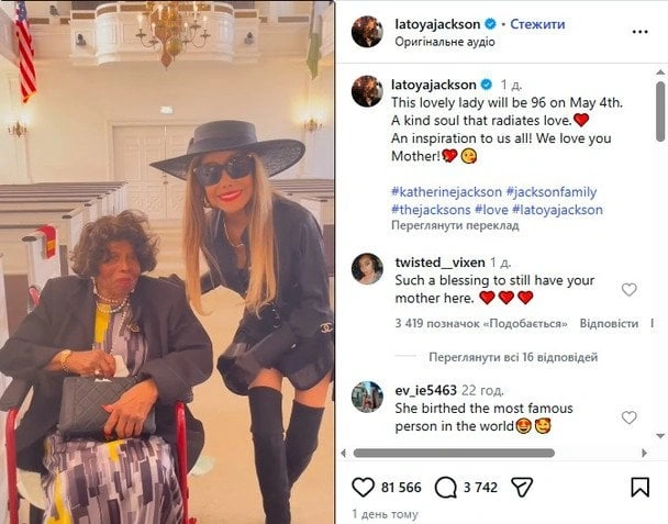 La Toya Cekson paylaşımında anasına olan sevgisini bu sözlərlə ifadə edib: "Bu gözəl xanımın 4 mayda 96 yaşı tamam olacaq. Sevgi saçan xeyirxah bir ruh və hamımız üçün ilham mənbəyi! Səni sevirik, ana!"