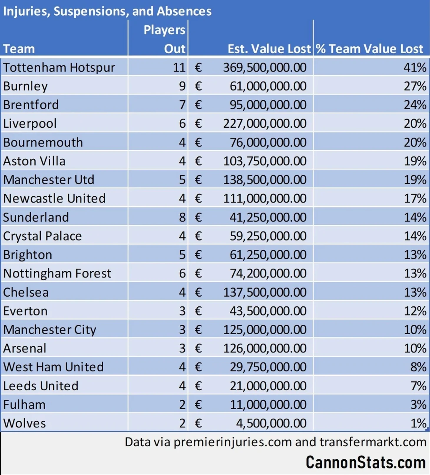 CannonStats, zədələr və cəzalar səbəbindən hansı İngiltərə Premyer Liqa klubunun transfer dəyərində ən çox itki verdiyini müəyyən etmək üçün Transfermarkt və PremierInjuries (Premier Liqa oyunçularının bütün zədələrini izləyən veb sayt) məlumatlarından istifadə edib.