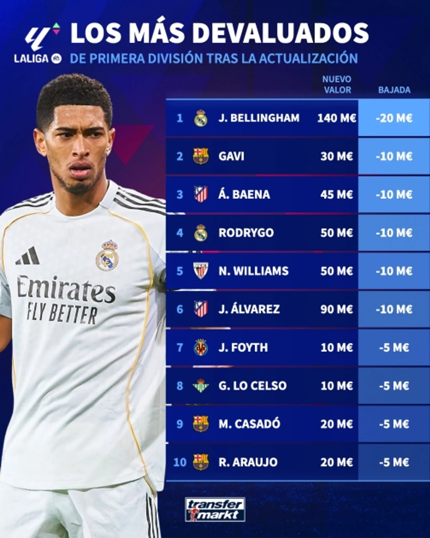 Cud Bellinqemin transfer dəyəri 20 milyon avro azalma yaşanıb. Beş oyunçu liqada ikinci ən pis nəticəni göstərib və onların dəyəri 10 milyon avro azalıb.