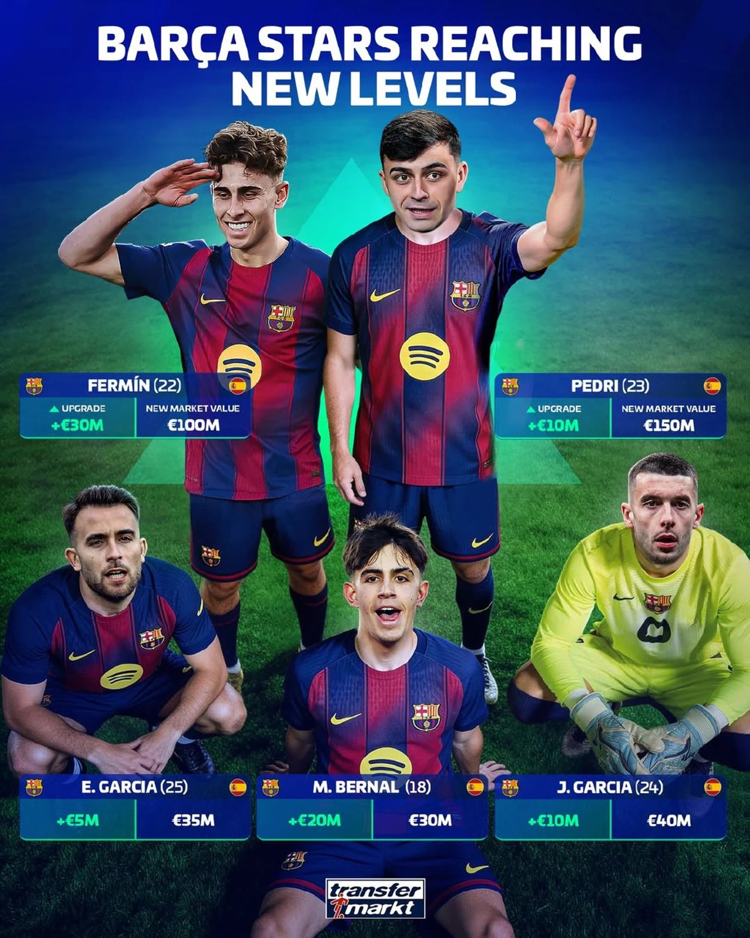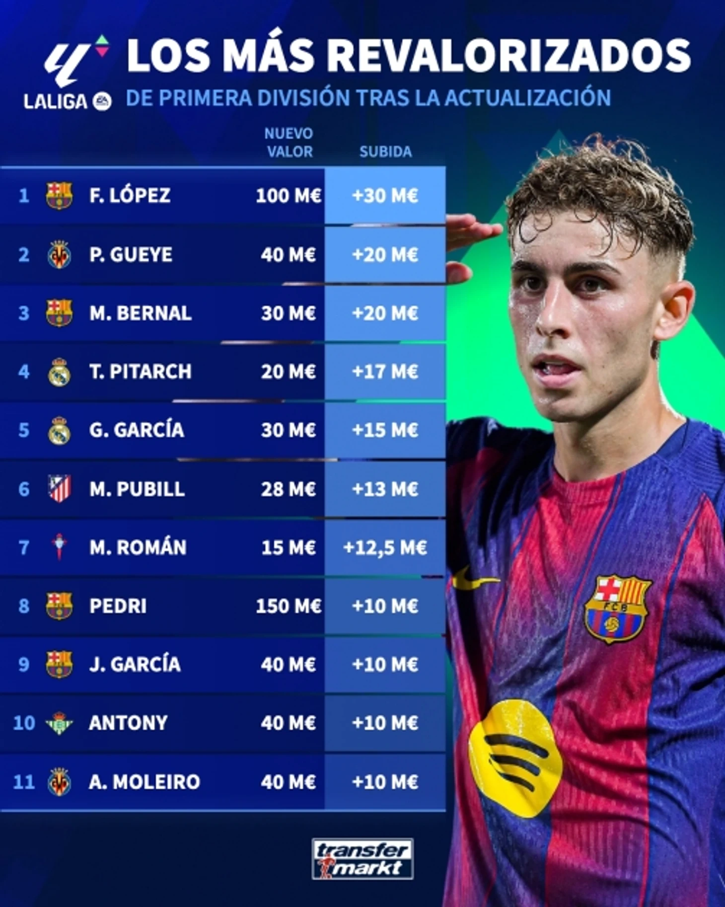 Transfer dəyəri 30 milyon avro artan Fermin Lopes 100 milyon avroya yüksəlib - bu, yeniləmənin ən yaxşı nəticəsidir. Mark Bernal kimi "Villarreal"dan Pap Quye 20 milyon avro bahalaşıb.