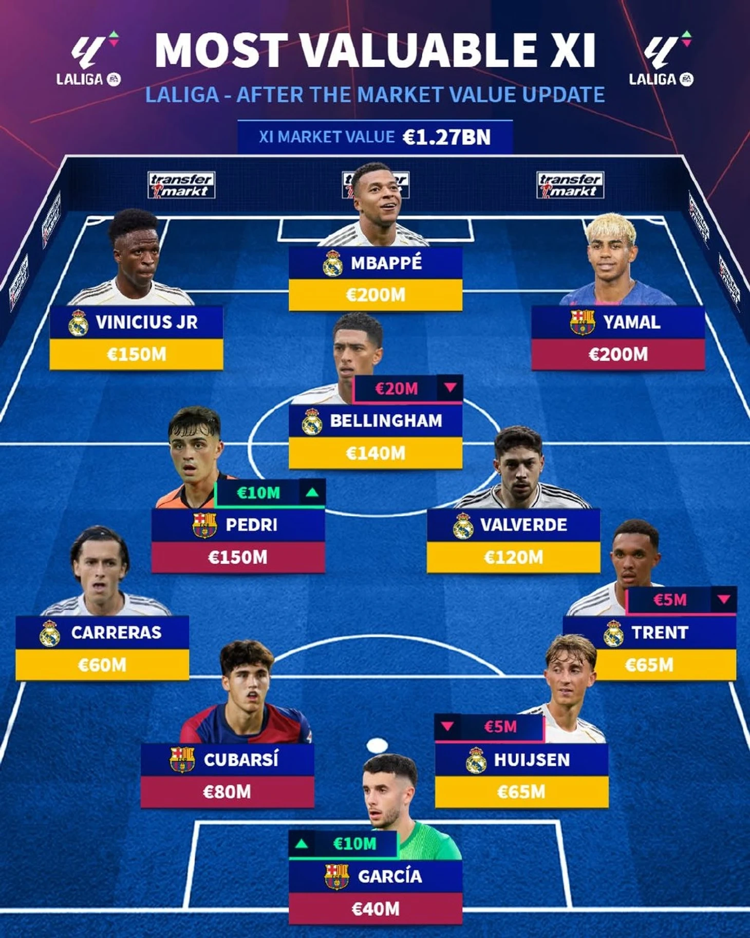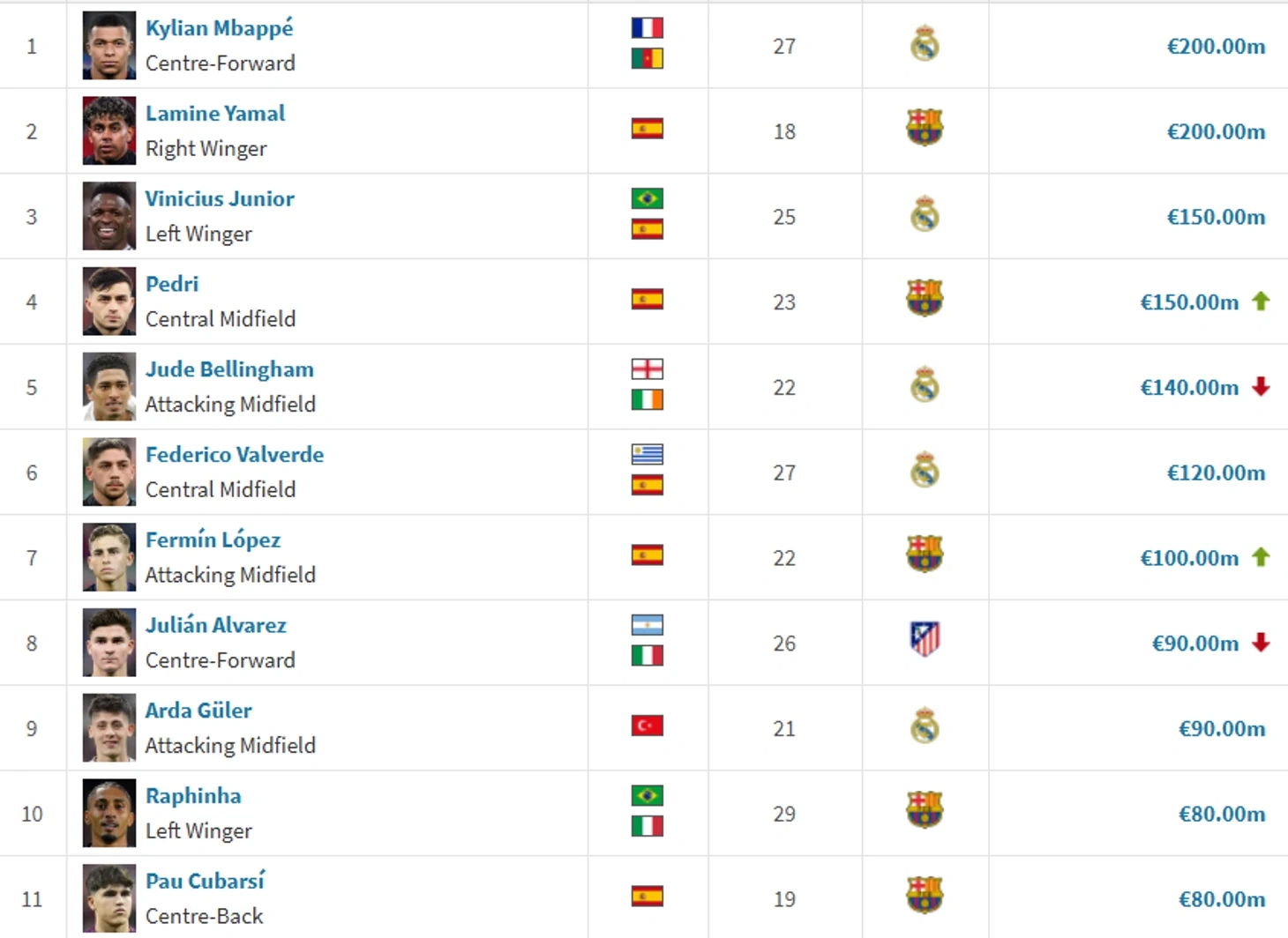 Çempionatın ən bahalı futbolçularının onluğunda dəyişikliklər var. Bellinqem üçüncü yerdən beşinci yerə keçib. Vinisiusun dəyəri dəyişməyib, ancaq klub yoldaşının azalması sayəsində üçüncü yeri tutub. Braziliyalı mövqeyini dəyəri 10 milyon avro artan Pedri ilə bölüşməli olacaq. Fermin və Xulian Alvares yerləri dəyişdiriblər.