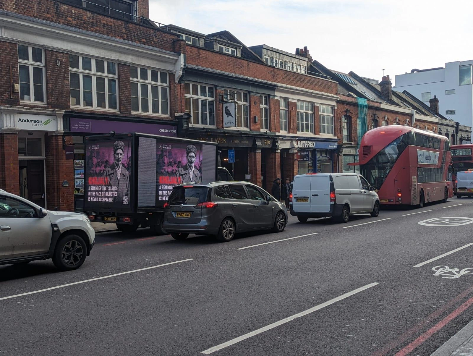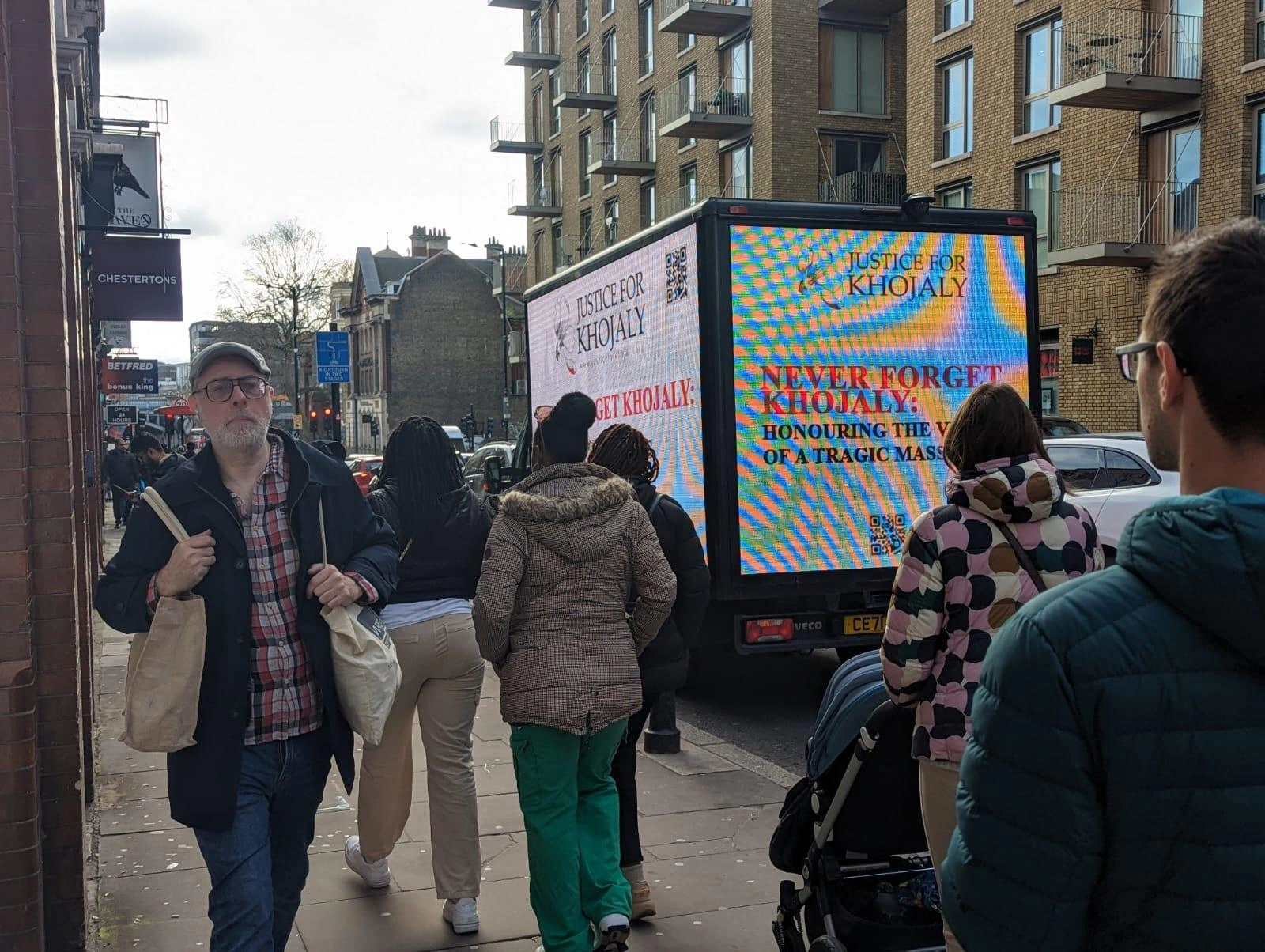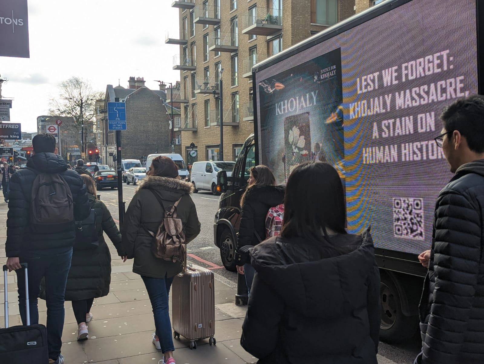 Xocalı soyqırımına aid foto və şüarları əks etdirən LED ekran quraşdırılmış maşınlar London və Edinburq şəhərlərində yerləşən rəsmi qurumların binalarının qarşısından keçməklə, əhalinin daha sıx olduğu mərkəzi küçələr boyunca hərəkət edib.