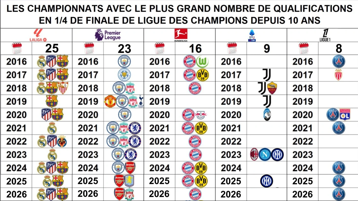 La Liqanın Avropa yarışlarının bu mərhələsinə 25 klub, Premyer Liqanın isə iki az - 23 klub göndərdiyini aşkar edilir. Daha da təəccüblüsü isə Bundesliqanın Serie A-dan təxminən iki dəfə çox - 16-9 klubu olmasıdır. “Bavariya” yalnız 2019-cu ildə bu mərhələyə çıxa bilməyib. Bu arada, italyanlar Liqa 1-dən yalnız bir klub öndədirlər.