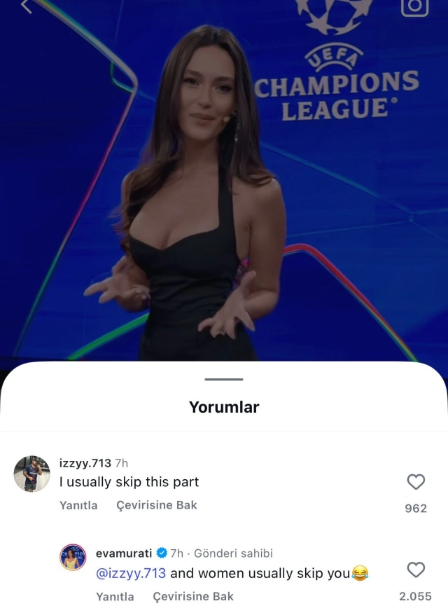 Çempionlar Liqasının aparıcısı Eva Murati istifadəçinin "Mən bu hissəni atlayıram" şərhinə "Qızlar da səni atlayır" cavabı sosial mediada böyük ajiotaj yaradıb.