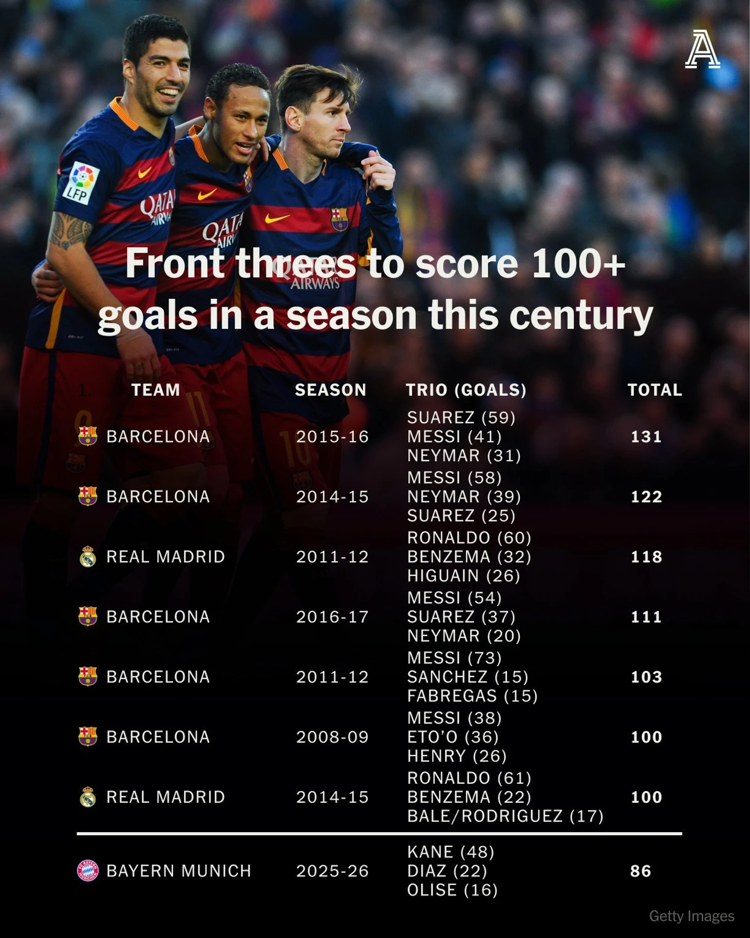 Məlumata görə, 21-ci əsrdə Avropanın ən yaxşı beş komandasından üçü bir mövsümdə daha çox qol vurub. "Bavariya" nın üçlüyü "Real" və "Barselona"nın üçlüyünü keçmək üçün daha 15 qol vurmalıdır.