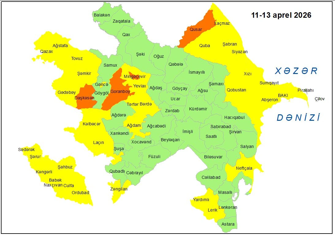 Milli Hidrometeorologiya Xidmətindən Lent.az-a bildirilib ki, aprelin 11-13-də Bakıda və Abşeron yarımadasında, Naxçıvan MR, Xızı, Siyəzən, Quba, Xaçmaz, Şabran, Gəncə, Şəmkir, Qazax, Tovuz, Ağstafa, Gədəbəy, Ağdam, Kəlbəcər, Laçın, Zəngilan, Yevlax, Bərdə, Tərtər, Neftçala, Lerik, Yardımlı, Qobustanda sarı xəbərdarlığa uyğun olaraq şimal-qərb küləyi əsəcək, küləyin sürəti 13.9-20.7 m/san təşkil edəcək.