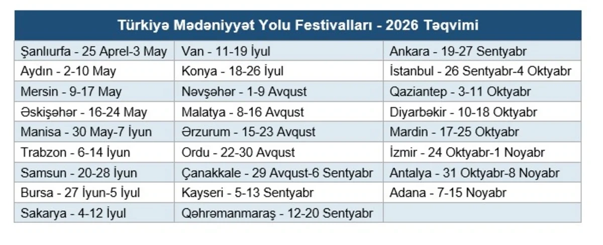 Xatırladaq ki, Türkiyənin Mədəniyyət və Turizm Nazirliyinin təşkilatçılığı ilə həyata keçirilən layihənin əsası 2021-ci ildə Beyoğlu Mədəniyyət Marşrutu Festivalı ilə qoyulub. Qısa müddətdə ölkə üzrə sürətlə genişlənən festival 2025-ci ildə artıq 20 şəhəri əhatə edərək 9 645 tədbir, 50 mindən çox sənətçi və ümumilikdə 180 günlük proqramla yadda qalıb. 2026 mövsümü isə miqyas baxımından yeni rekord vəd edir: festivalın müddəti 234 günə çatdırılır və tədbirlər 26 bölgəni əhatə edəcək.