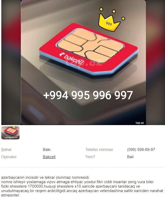 Azərbaycanda fantastik qiymətə mobil nömrə satılır.