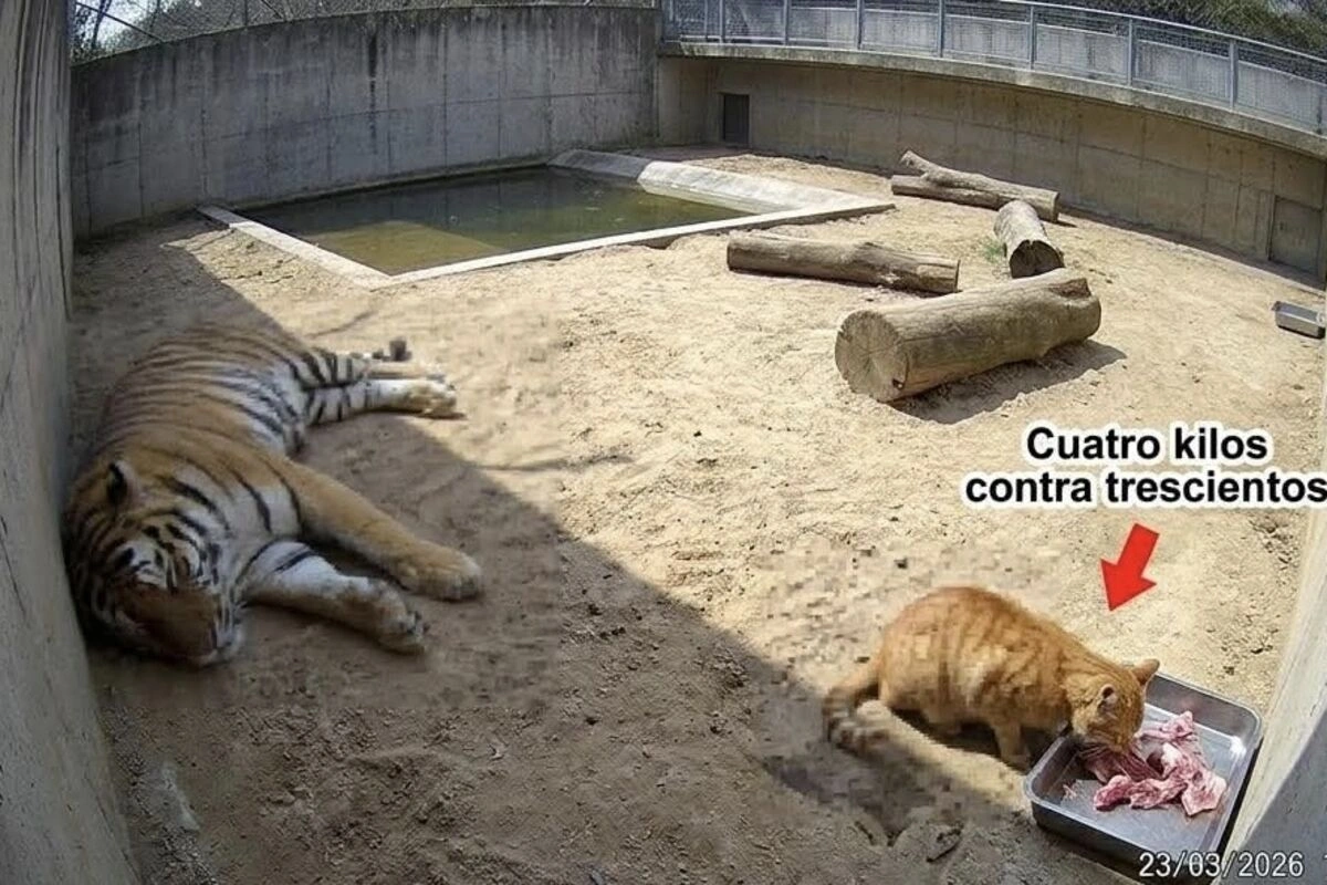 Zoopark baxıcılarının sözlərinə görə, kürən pişik artıq dörd aydır ki, müntəzəm şəkildə zolaqlı yırtıcının qəfəsinə daxil olur. Onun bunu necə bacardığı isə personal üçün hələ də sirr olaraq qalır. Müşahidə kameraları yalnız nəticəni qeydə alır: pişik sanki sehrli şəkildə çiy ətlə dolu böyük qabın yanında peyda olur. O, həftədə üç-dörd dəfə qəfəsə girir və hər dəfə pələng artıq yaxşıca doyub, gündüz istisindən yorularaq dərin yuxuya getdiyi anı seçir. Yeməyini yedikdən sonra isə heç nədən çəkinmədən sakitcə təhlükəli ərazini tərk edir.