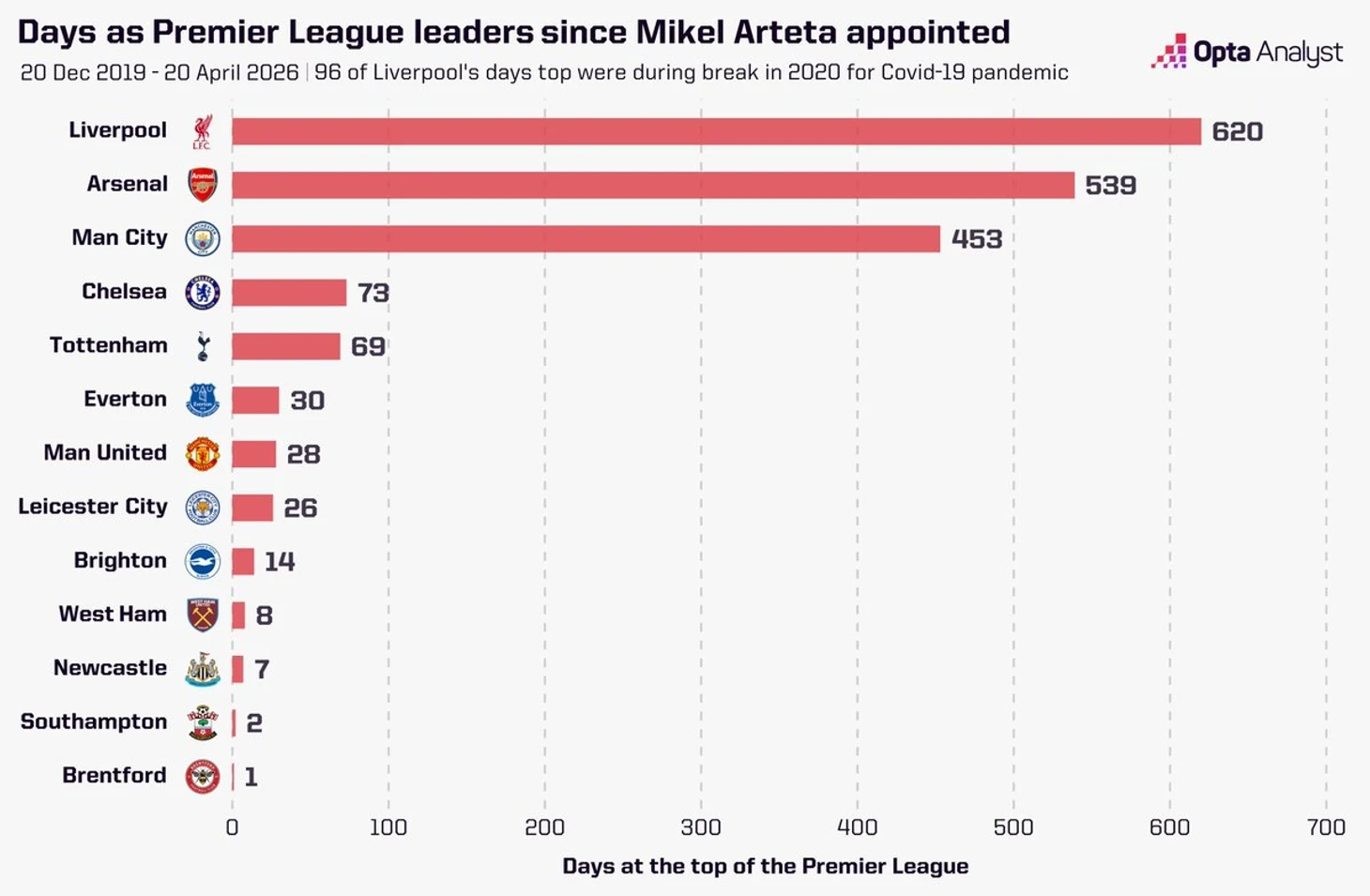 Lent.az-ın xarici mediaya istinadən məlumatına görə, o vaxtdan bəri "topçular" Premyer Liqada ümumilikdə 539 gün liderlik ediblər. Yalnız "Liverpul" daha uzun müddət liderliyi əlində saxlayıb.