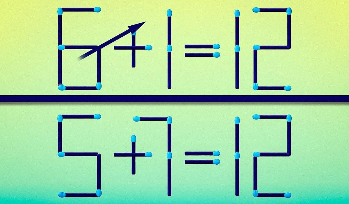 Gördüyünüz kimi, düzgün həll 6 rəqəmindən bir kibriti çıxarıb 1 rəqəminə əlavə etməkdir. Nəticədə 6 5-ə, 1 isə 7-yə çevrilir. Beləliklə, düzgün tənliyi alırıq: 5 + 7 = 12.