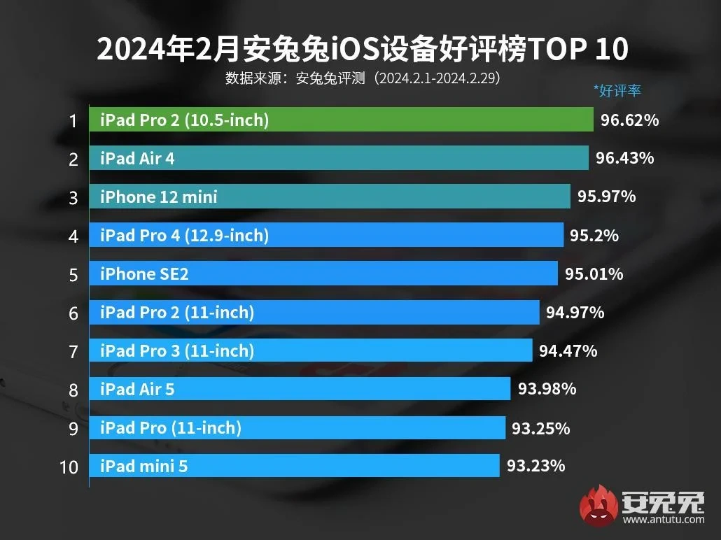 10,5 düymlük “iPad Pro 2” 96,69% müsbət rəylə “Apple” reytinqində liderlik edib. Bu planşetin istehsalı çoxdan dayandırılıb, lakin brendin pərəstişkarları ondan istifadə etməyə davam edirlər. Onu 96,43% balla 2020-ci ildə buraxılan “iPad Air 4” izləyir.
