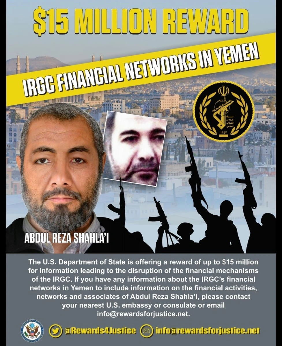 ABŞ “Ədalət üçün yardım” kampaniyası çərçivəsində Əbdül Rza Şahlayın maliyyə fəaliyyəti, əlaqələri və tərəfdaşları haqqında məlumat üçün 15 milyon dollara qədər mükafat təklif edir.