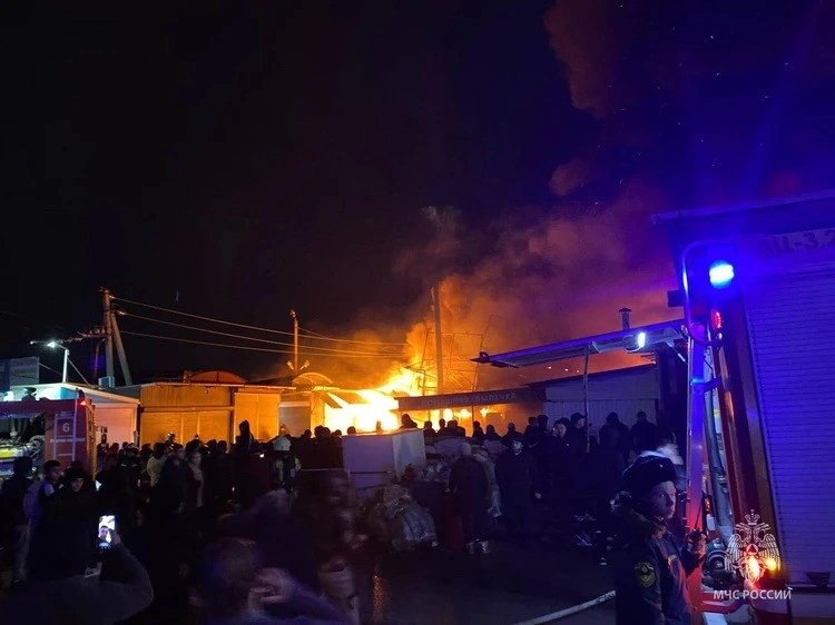 Lent.az Rusiya KİV-ə istinadla xəbər verir ki, yanğın sahəsi 1500 kvadrat metrdən çoxdur. İlkin məlumata görə, yanğın ticarət pavilyonlarından birində başlayıb, sonra digərlərinə keçib.
