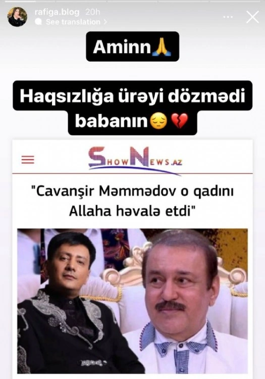 Lent.az xəbər verir ki, mərhum müğənninin nəvəsi Rəfiqə Qafarova öz sosial şəbəkə hesabında babası ilə bağlı "Babamın haqsızlığa ürəyi dözmədi" deyə şərh yazıb.