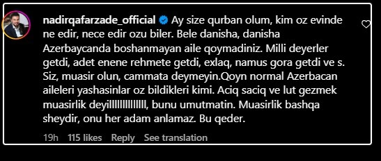 Siz müasir olun, camaata dəyməyin. Qoyun, normal Azərbaycan ailələri öz bildikləri kimi yaşasınlar. Açıq-saçıq və lüt gəzmək müasirlik deyil, bunu unutmayın. Müasirlik başqa şeydir, onu hər adam anlamaz. Bu qədər!”.