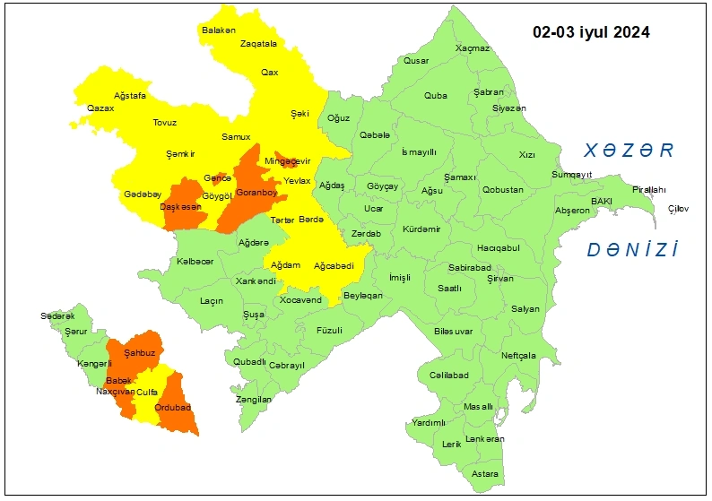 İyulun 2-3-də bölgələrdə gözlənilən güclü küləkli hava şəraiti ilə bağlı Milli Hidrometeorologiya Xidməti tərəfindən sarı və narıncı xəbərdarlıq verilib.