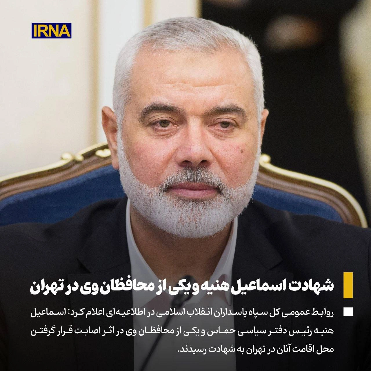 Lent.az "MOUZE" teleqram kanalına istinadən xəbər verir ki, Haniyyə İranın yeni prezidenti Məsud Pezeşkianın andiçmə mərasimində iştirakından sonra İsrail tərəfindən onun Tehrandakı iqamətgahına basqın olub.