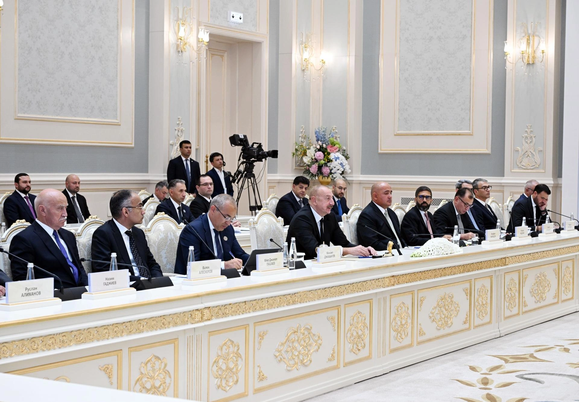 Əvvəlcə bu görüşün keçirilməsi təşəbbüsünə görə Özbəkistan Prezidentinə təşəkkür etmək istərdim. Qeyd edim ki, mənim praktikamda belə görüşlər heç vaxt olmayıb. Rəsmi səfərlər çərçivəsində biznes forumlarında iştirak etdiyim, yaxud xarici dövlət başçılarının səfərləri zamanı Bakıda biznes forumlarının keçirildiyi hallar olub, amma bir qayda olaraq onlar dövlət başçılarının hansısa qısa nitqlərlə müraciət etmələri ilə məhdudlaşıb, sonra çıxıb gediblər, biznes-forum isə öz axarı ilə davam edib. Prinsipcə, bu günlərdə Daşkənddə keçirilən biznes-forum layihələrlə çox zəngin olub. Amma nisbətən məhdud tərkibdə iki ölkənin işgüzar dairələrinin əsas nümayəndələrinin belə bir görüşü mənim praktikamda ilk dəfədir keçirilir. Ona görə də bundan başlamaq və Şavkat Miromonoviçə təşəkkürümü bildirmək istəyirəm.