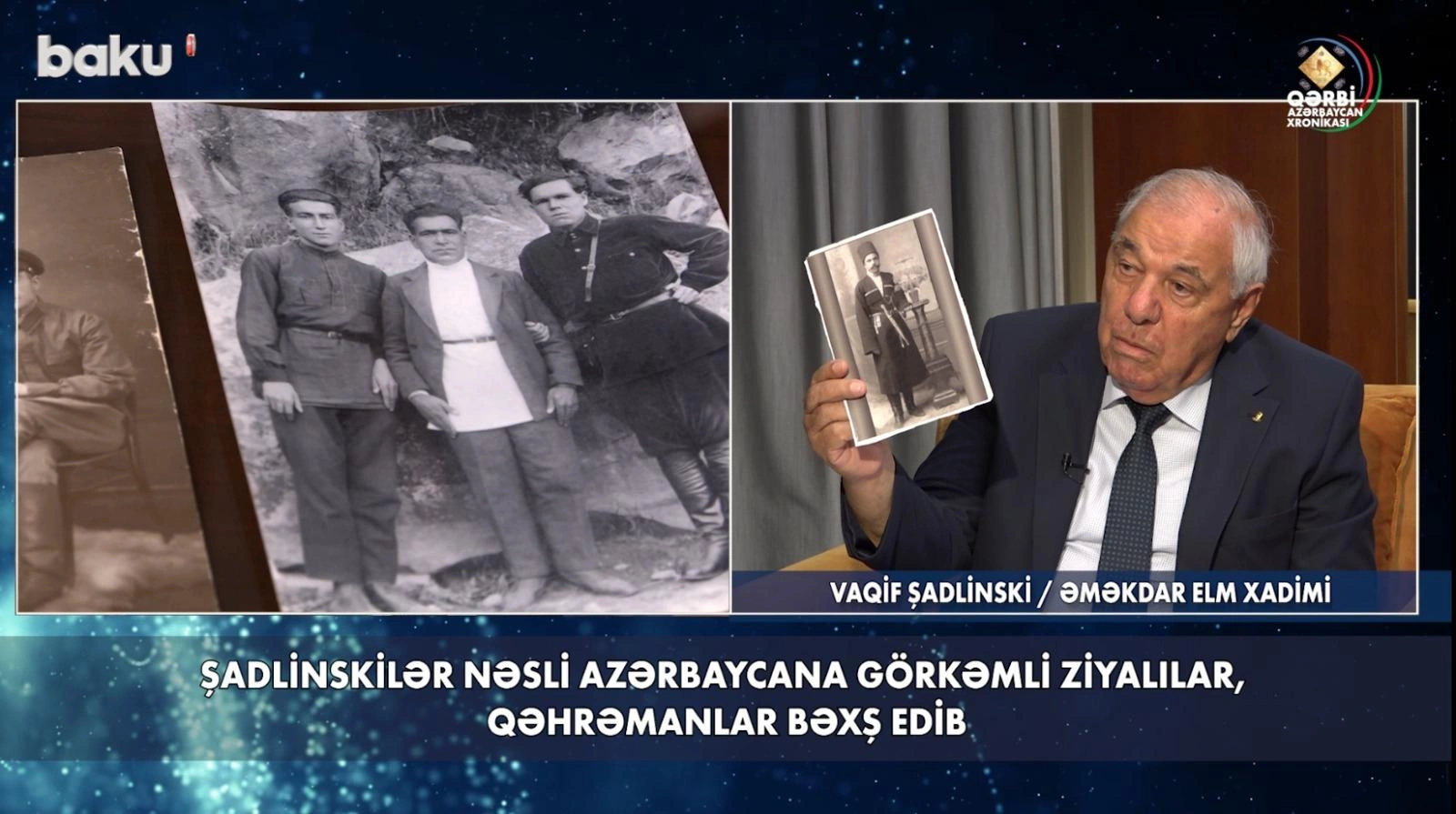 O, Azərbaycanın tarixində dəyərli izlər qoymuş, mədəni-maarif və təhsil sahəsində böyük xidmətlər göstərmiş əsilzadə Şadlinskilər nəslindən söhbət açıb. Bildirib ki, bu nəsil Qərbi Azərbaycanın Vedi bölgəsinin tanınmış soylarındandır. Müsahibin sözlərinə görə, mükəmməl şəcərəsi olan nəsil Azərbaycana görkəmli ziyalılar, qəhrəmanlar bəxş edib. Onlardan Aslan Sultan Şadlinski, Nəsrulla bəy Şadlinski, Abbasqulu bəy Şadlinski, Bilas Şadlinski, Vaqif Şadlinski və digərlərinin fəaliyyəti gələcək nəsillərə örnək ola biləcək səhifələrlə zəngindir.