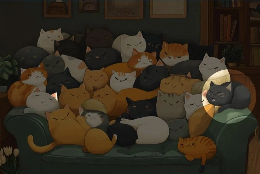 O, dinclik və sakitlik axtarıb və onu evində olan onlarla oyuncaq pişik arasında tapıb - sahibləri pişikləri sevirlər, buna görə də belə oyuncaqlar toplayırlar. Tapşırığınız 5 saniyə ərzində pişiyi tapmaqdır.