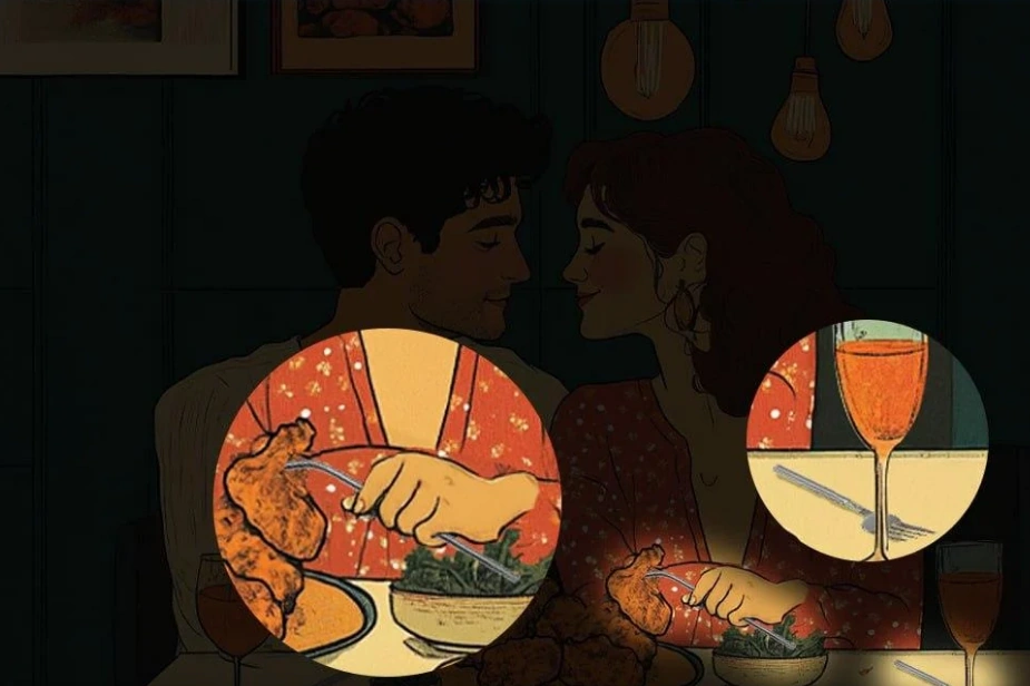 Budur, romantik bir şam yeməyi zamanı xoş ünsiyyətdə olan bir kişi və bir qadın aşiqdir. Qız zərif paltar geyinib, oğlan isə yüngül sviter geyinib. Süfrədə stəkan içkilər və bəzi dadlı yeməklər görə bilərsiniz. Müəssisənin divarlarından rəsmlər, tavandan işıq lampaları asılıb.