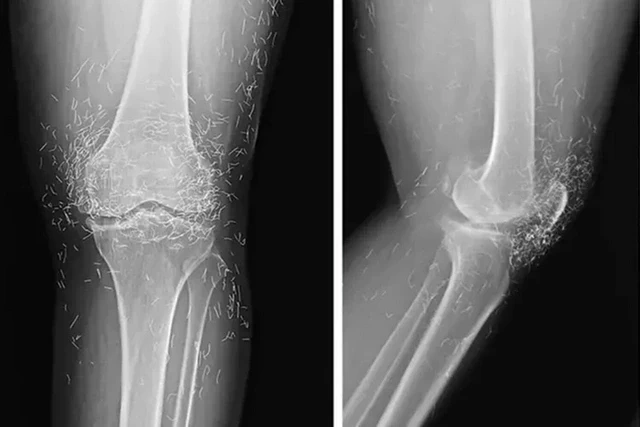Rentgen müayinəsi zamanı sümüklərin qalınlaşması və deformasiyası, osteoartritin tipik əlamətləri, eləcə də diz oynağının ətrafındakı toxumaya yerləşdirilmiş yüzlərlə qızıl fraqmentlər müəyyən edilib.