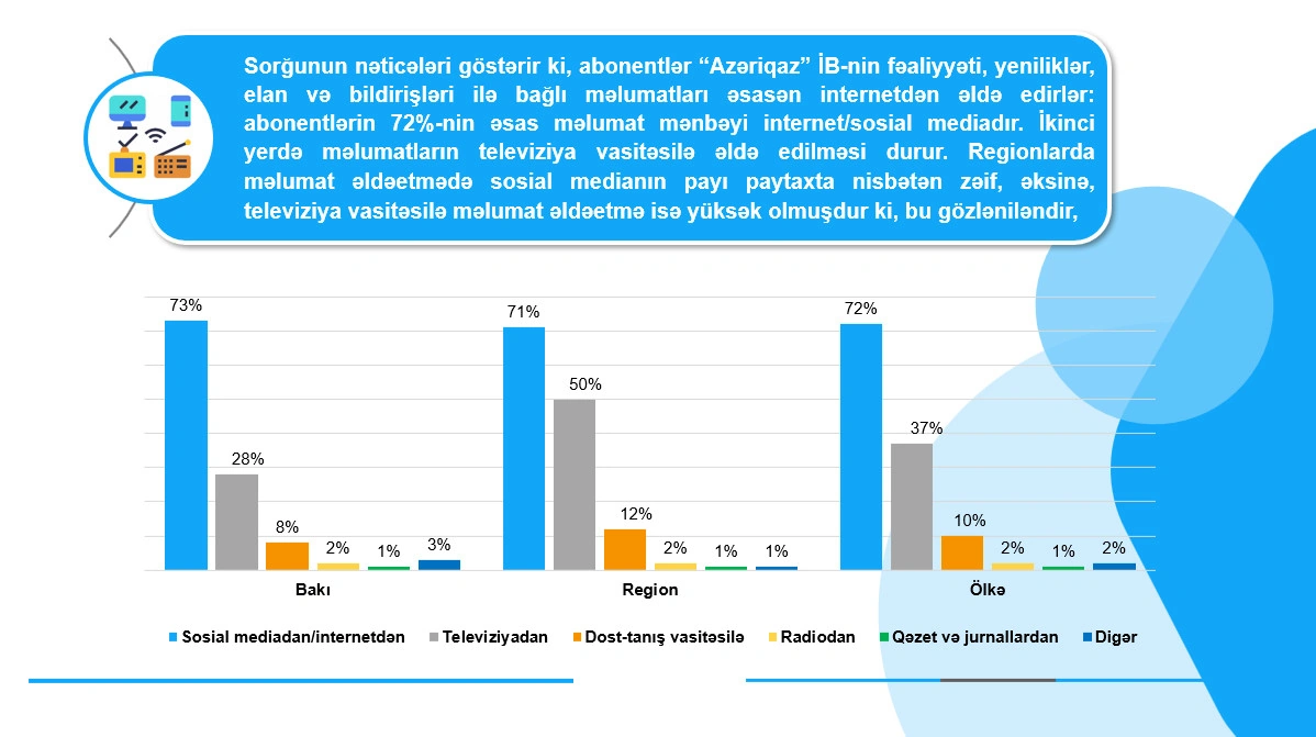 Lent.az xəbər verir ki, birliyin “ASAN xidmət” və “ASAN Kommunal” mərkəzlərindəki xidmətləri, eləcə də 104/185 Çağrı mərkəzinin və Qəza xidmətinin əməkdaşlarının fəaliyyəti barədə abonentlər arasında sorğu aparan “QBS Consulting” MMC son olaraq “Azəriqaz” İB-nin ümumi fəaliyyəti, yenilikləri, elan və bildirişləri necə əldə etmələri ilə bağlı sorğu keçirib.