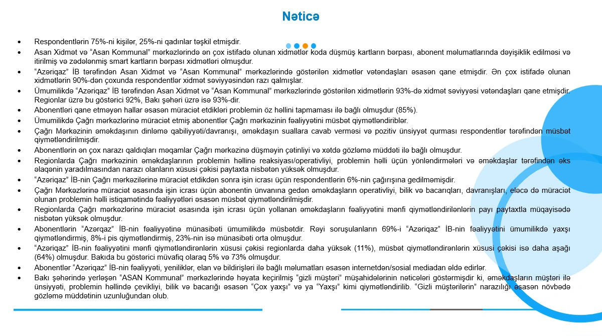 Abonentlərə göstərilən xidmətin qiymətləndirilməsi və müştəri məmnunluğunun yoxlanılması məqsədi ilə “QBS Consulting” MMC tərəfindən 2000 abonent arasında sorğu keçirilib.