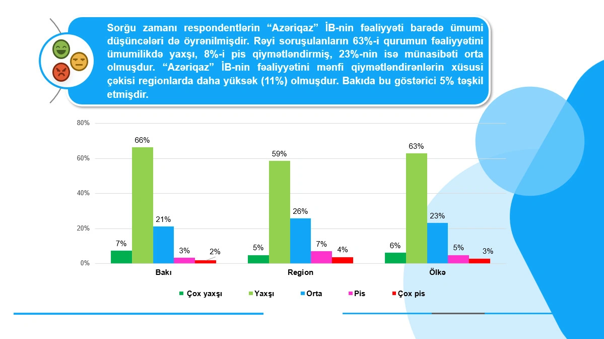 Respondentlərin ümumi düşüncələrinin öyrənildiyi sorğuda rəyi soruşulanların 63 %-i ümumilikdə Birliyin fəaliyyətini yaxşı qiymətləndirib. 23%-inin münasibəti orta, 8%-nin isə pis olub. Sorğunun nəticələri barədə göstərilən diaqramlardan daha ətraflı məlumat əldə edə bilərsiniz.