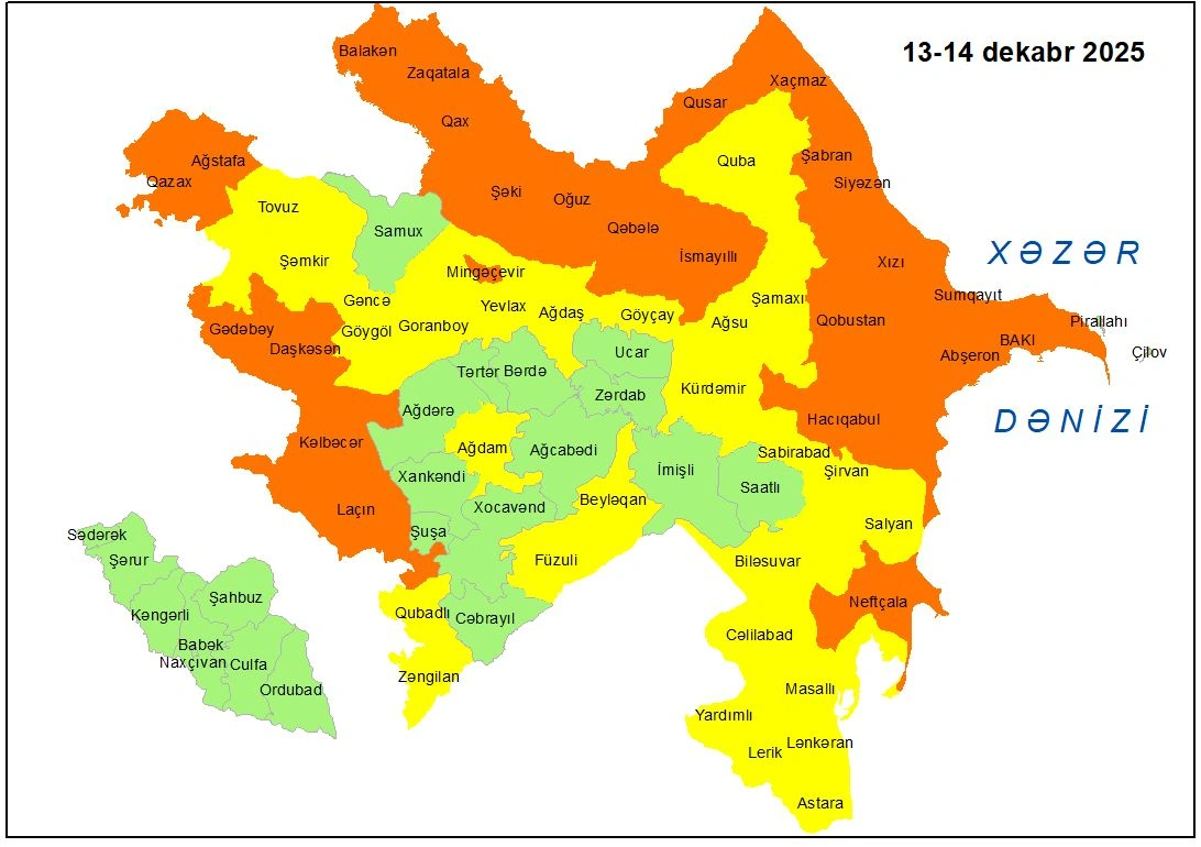 Milli Hidrometeorologiya Xidmətindən Lent.az-a bildirilib ki, dekabrın 13-ü axşamdan 14-ü gündüzədək Bakıda və Abşeron yarımadasında Şəki, İsmayıllı, Qəbələ, Qobustan, Hacıqabul, Oğuz, Mingəçevir, Şabran, Xaçmaz, Qusar, Siyəzən, Xızı, Ağstafa, Qazax, Kəlbəcər, Laçın, Neftçala, Daşkəsən, Gədəbəy, Balakən, Qax, Zaqatalada narıncı xəbərdarlığa uyğun olaraq şimal-qərb küləyi əsəcək, küləyin sürəti 20.8-28.4 m/san-dək güclənəcək.
