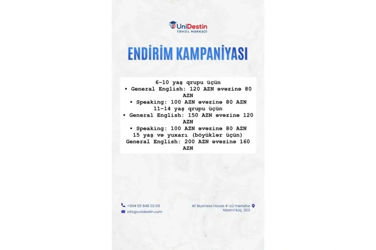 General English: 120 AZN əvəzinə 80 AZN Speaking: 100 AZN əvəzinə 80 AZN