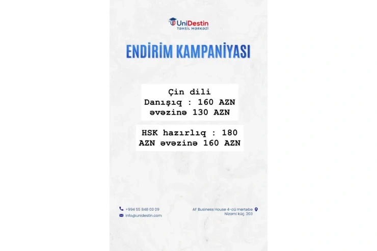 UniDestin Təhsil Mərkəzi yeni ilin gəlişi münasibətilə ingilis dili və çin dili kursları üzrə xüsusi bayram endirimlərinə start verdiyini elan edir.