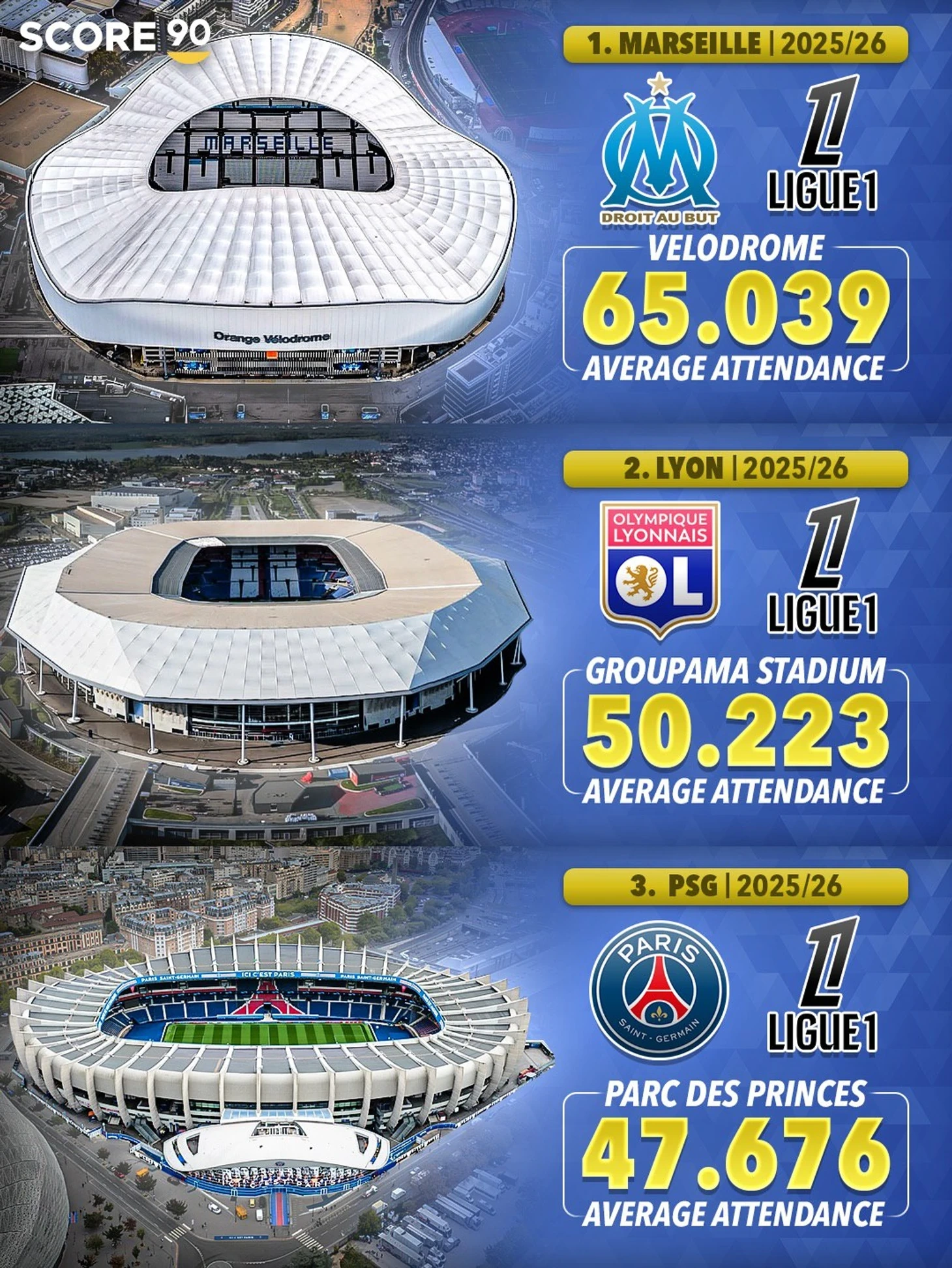 Avropanın ən yaxşı beş klubu arasında Fransa ən az tamaşaçı kütləsinə malikdir. Ən yaxşı göstərici “Marsel”dədir, hər oyunda orta hesabla 65.000 azarkeş iştirak edir.
