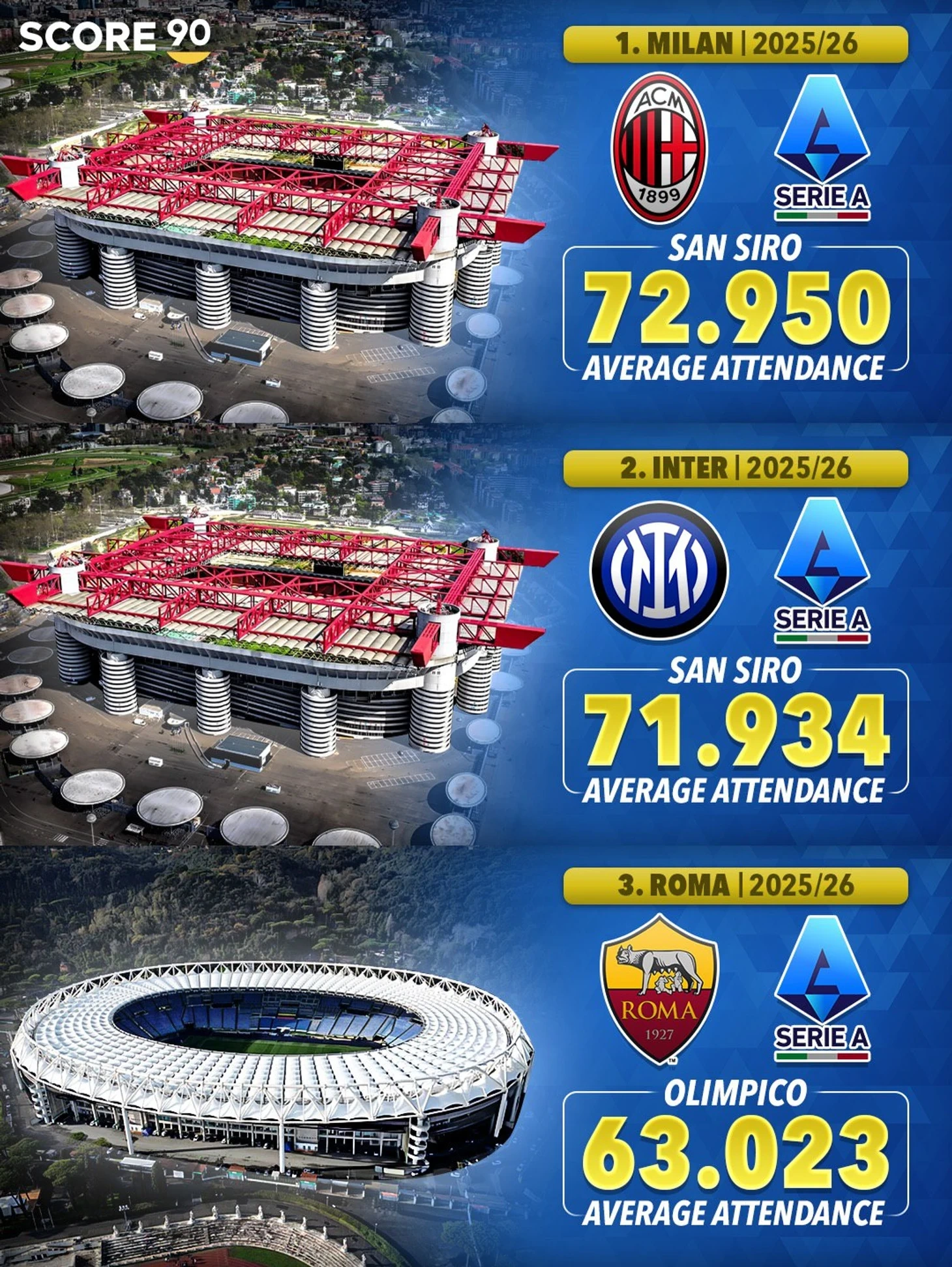 İtaliyada stadionlar arasında tac Milandadır: "Rossoneri"nin "San Siro"su hələ də "İnter"in "Cüzeppe Meatza" stadionundan bir qədər çox azarkeş cəlb edir.