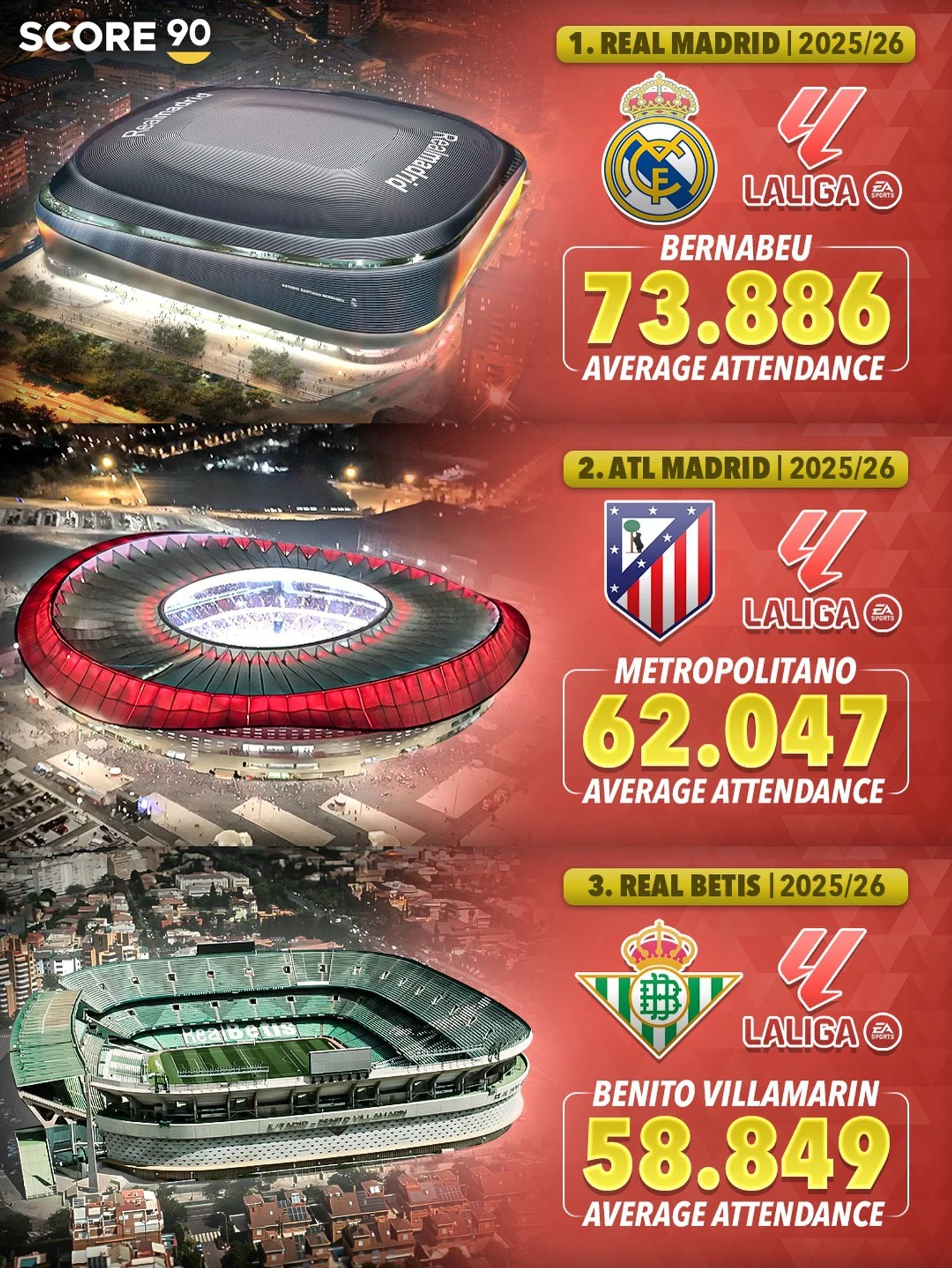 İspaniyada “Bernabeu”nun rəqibi yoxdur və La Liqa oyunlarına təxminən 74.000 azarkeş cəlb edir. “Atletiko” ikinci, “Real Betis” və Antonio azarkeşləri isə üçüncü yerdədir.
