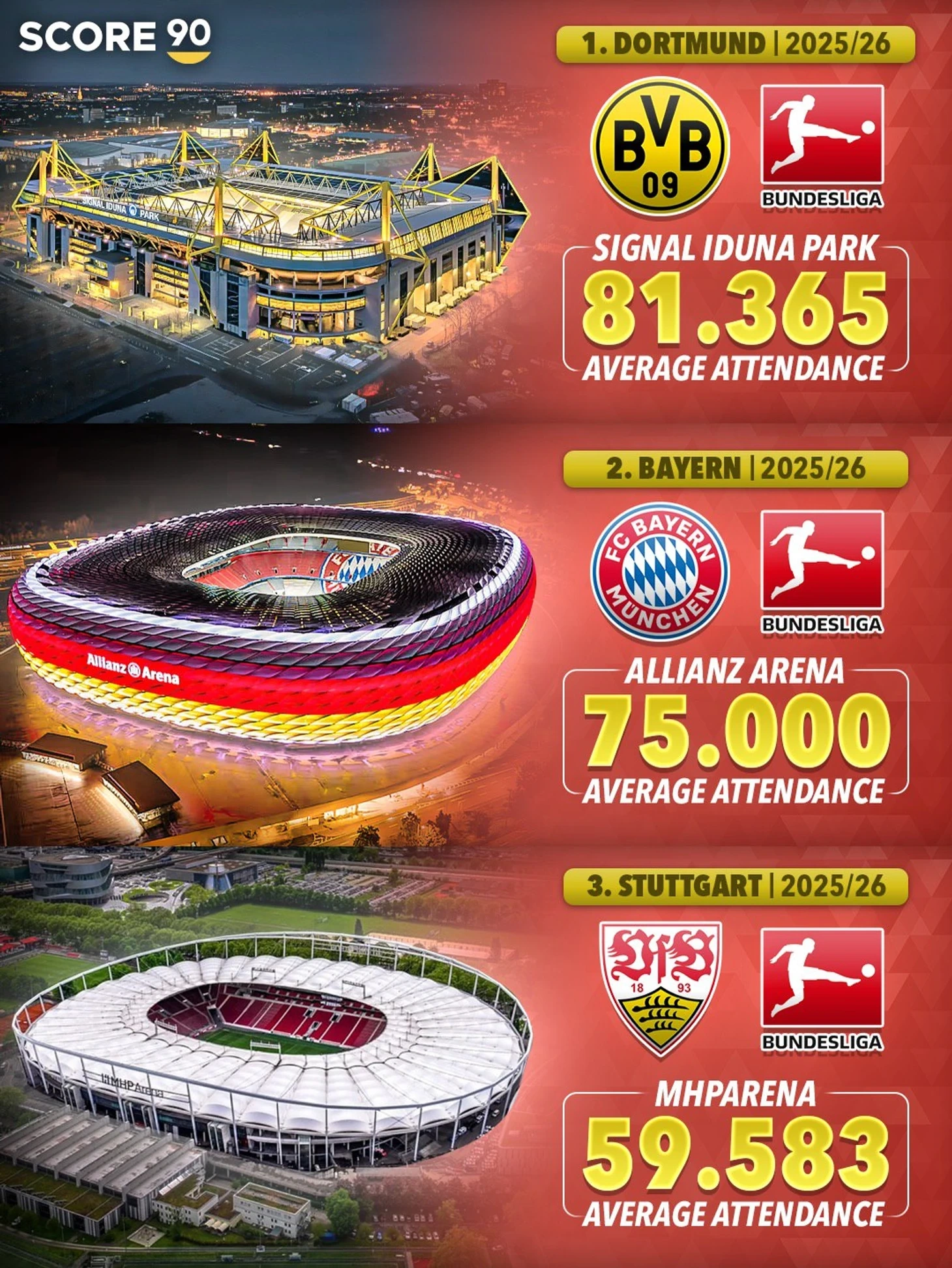 Almaniya çempionatı futbol stadionlarına tamaşaçı sayına görə Avropa lideridir. Alman klubları müntəzəm olaraq 100 faiz tamaşaçı tutumuna nail olurlar. Ölkənin ən böyük stadionları olan Dortmundun “Vestfalenstadion”u və Münhen “Bavariya”sının "Alyans Arena”sı liderlik edir.