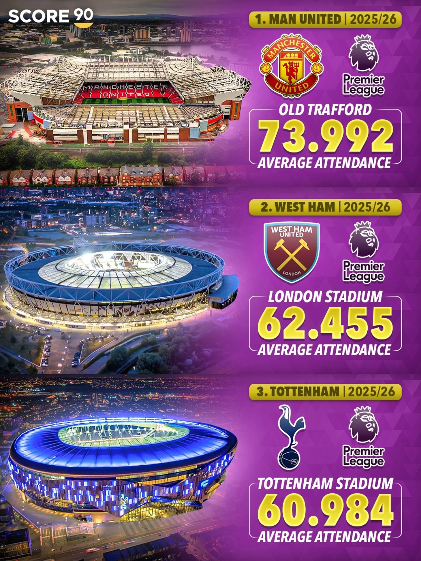 Qalan üç yeri isə London stadionları olan “Vest Hem” və “Tottenhem” tutur və hər oyuna 60.000-dən bir qədər çox azarkeş qatılır.