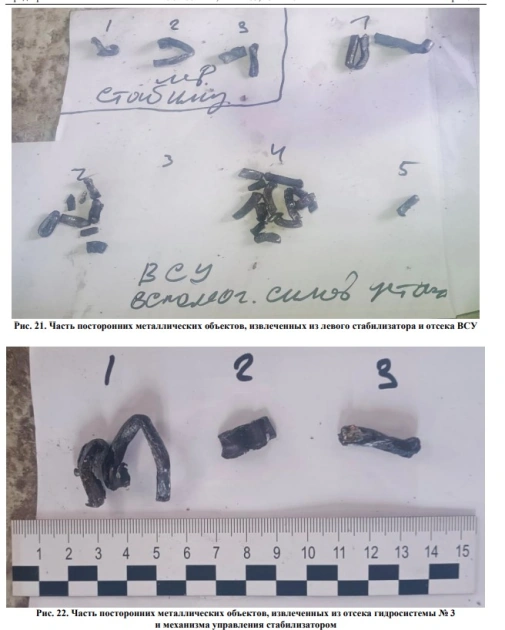 Hava gəmisi qalıqlarının kor zədələrində olan hava gəmisinə məxsus olmayan kənar obyektlər aşkarlanaraq götürülmüş və həmin kənar obyektlərin foto şəkilləri ilkin hesabat mətnində ictimaiyyətə təqdim edilmişdir. Gələcəkdə aşkar olunmuş kənar obyektlərin dəqiq mənsubiyyətinin müəyyənləşdirilməsi məqsədilə əlavə ekspertizaların keçirilməsi planlaşdırılmışdır;