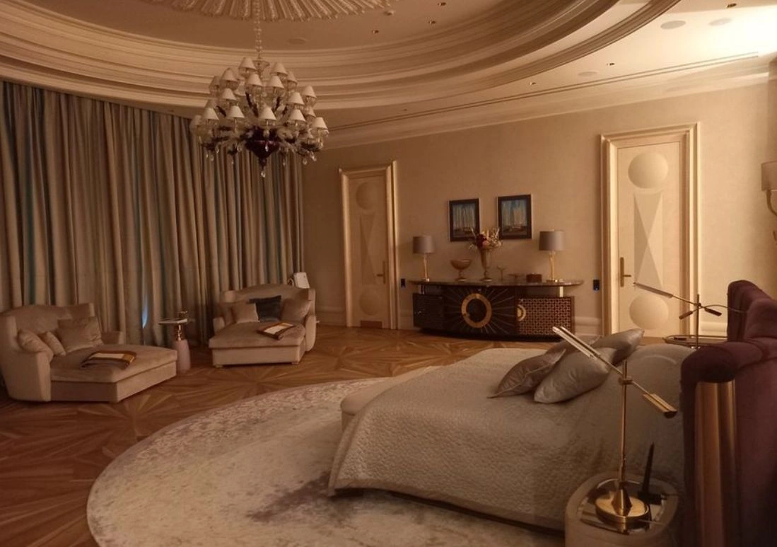 Sarayın interyerləri dəbdəbəli dəbdəbəsi ilə diqqəti cəlb edir. Korrupsiyaya qarşı mübarizə fondu mərmər və qızılı metal ilə işlənmiş 50 kvadratmetrlik vanna otaqlarının mərtəbə planlarını dərc edib.
