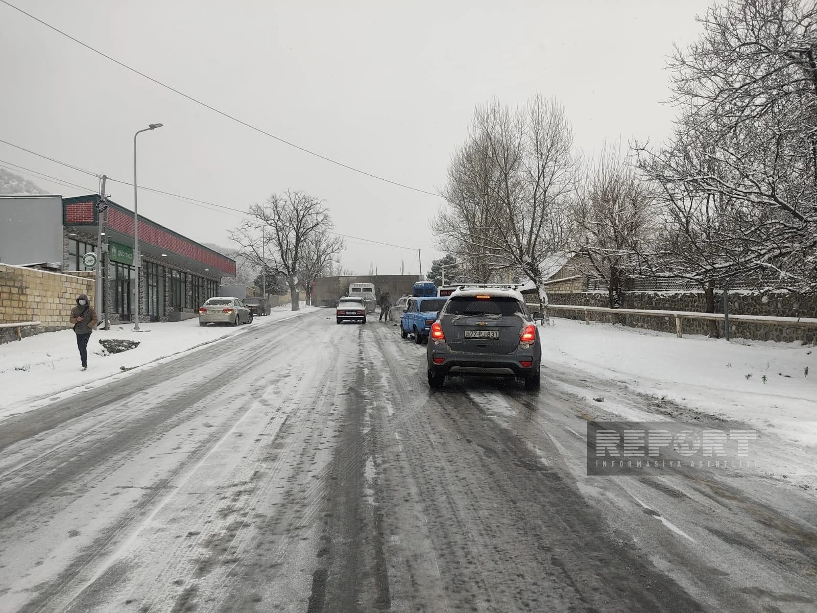 Şəkidə qar yolları iflic edib, avtomobillər yolda qalıb.