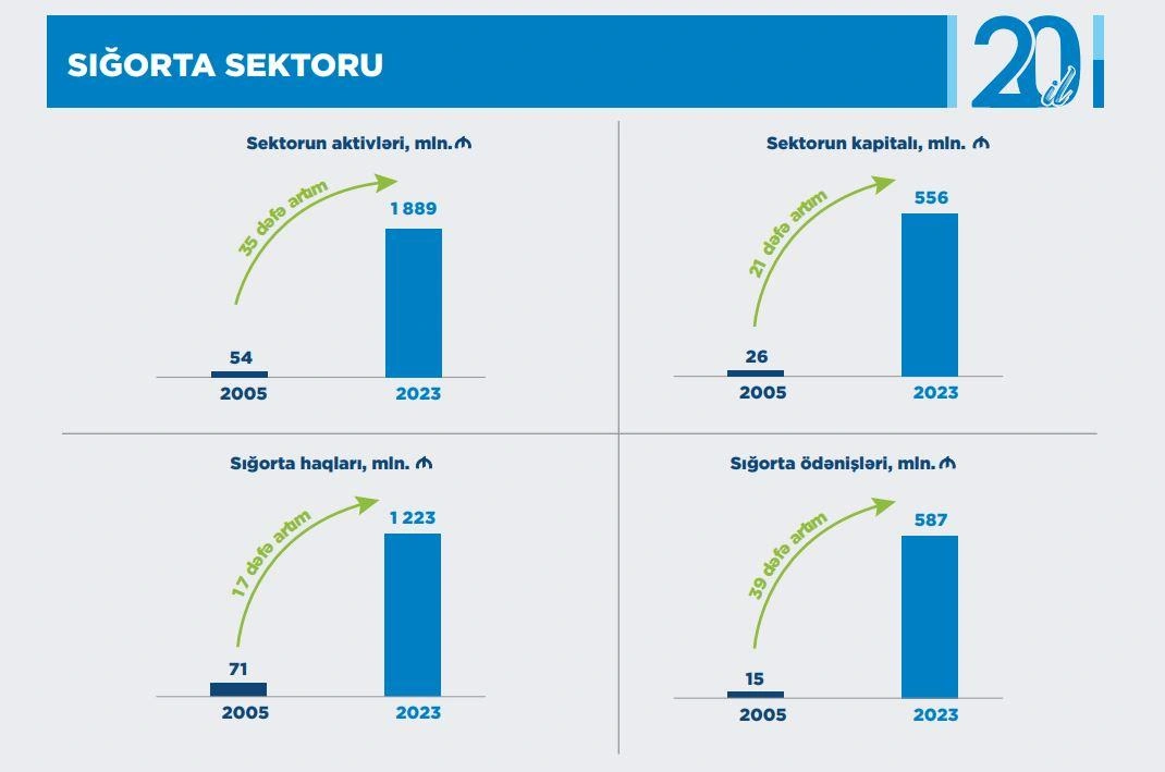 Azərbaycanın sığorta sektorunun aktivləri 2005-ci ilin yekununda 54 milyon manat olduğu halda, 2023-cü ilin yekununda 1 milyard 889 milyon manat olub ki, bu da 35 dəfə artım deməkdir.