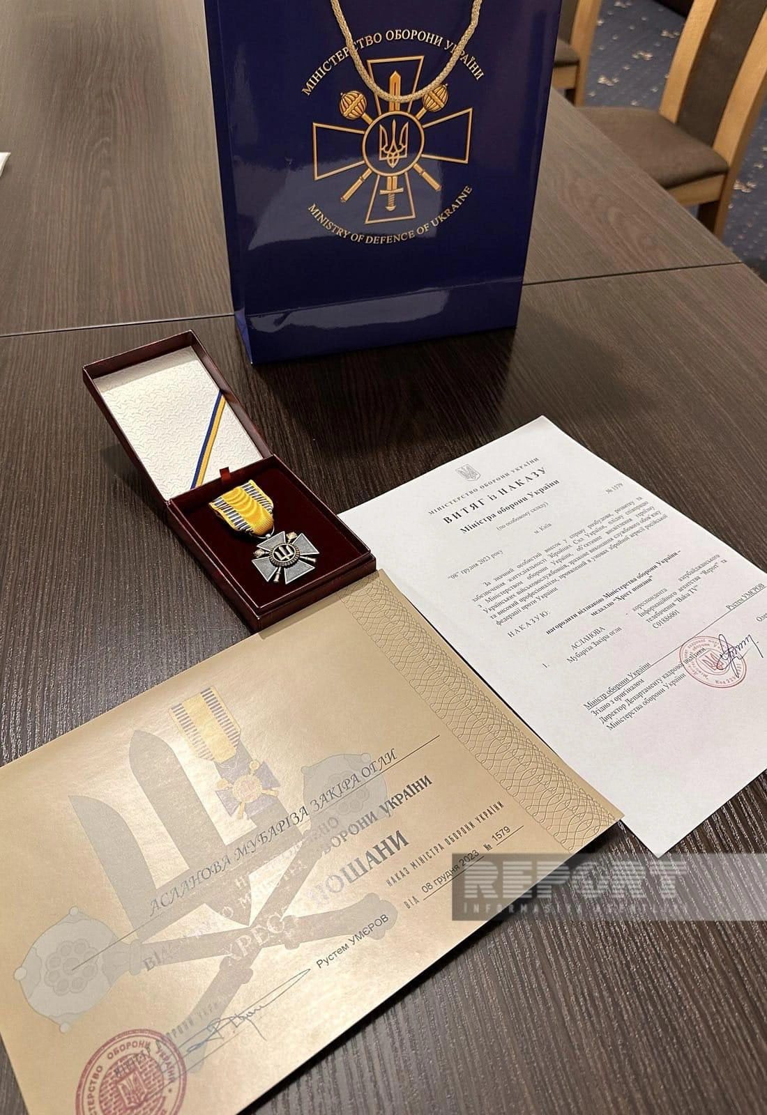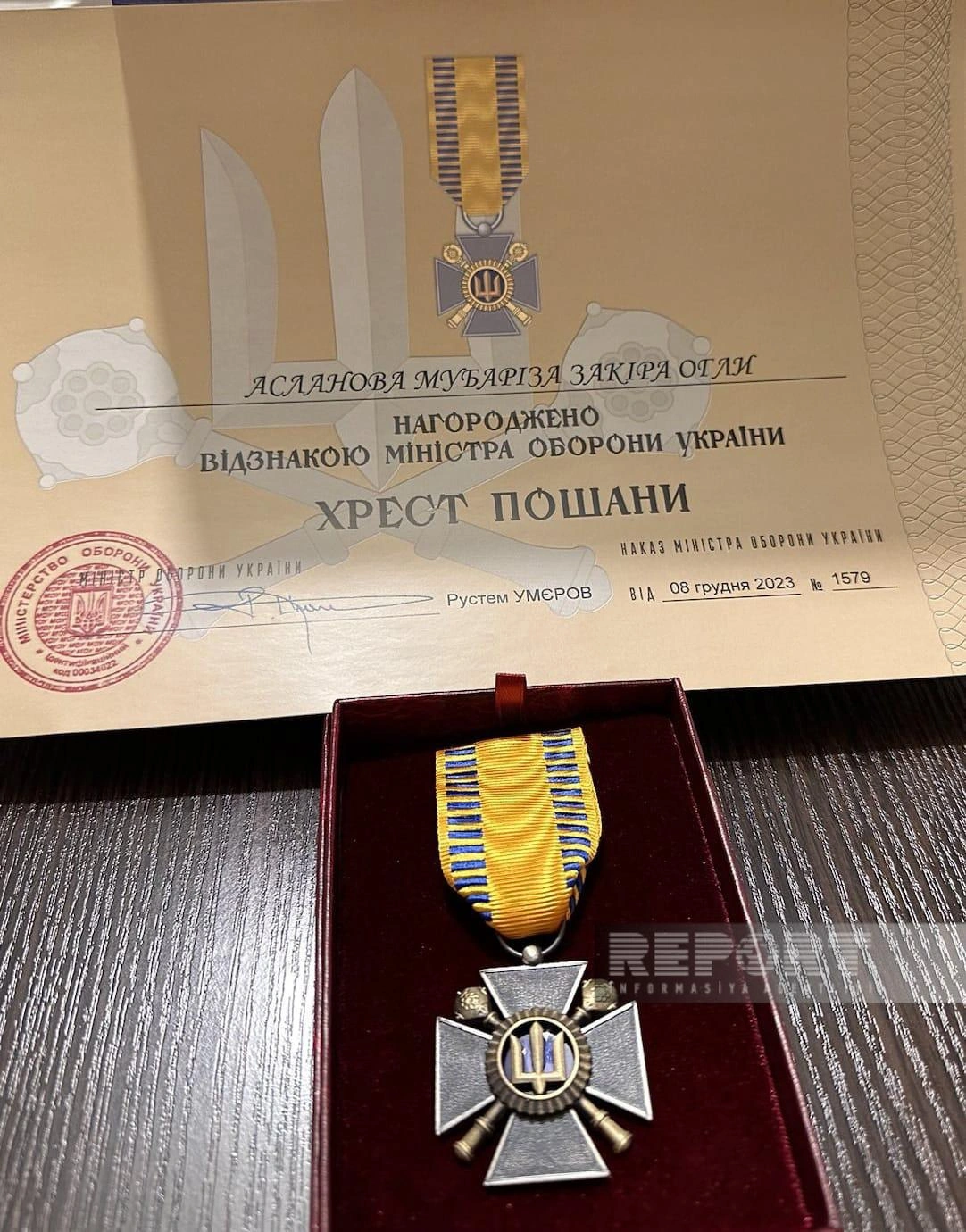 Nazirin imzaladığı xüsusi əmrlə Ukrayna Silahlı Qüvvələrinin fəaliyyətini peşəkar, Ukrayna hərbi qulluqçularının qəhrəmanlıqlarını obyektiv işıqlandırdığına, xidməti vəzifələrini nümunəvi yerinə yetirdiyinə, Rusiyanın Ukraynaya hərbi hücumu nəticəsində baş verənləri intensiv və hərtərəfli işıqlandırdığına, xalqlar arasında dostluqda informasiya sahəsində fəallığına görə "Report" İnformasiya Agentliyinin və "Baku" TV-nin xüsusi müxbiri Mübariz Aslanov dövlət mükafatlarından "Xaç Şərəfi" medalı ilə mükafatlandırılır, ona təşəkkür ifadə edilir.