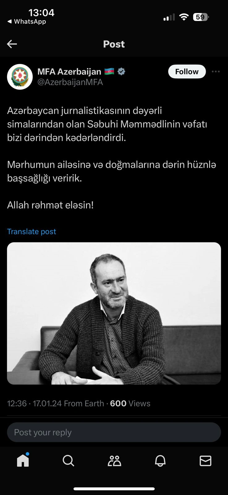 Azərbaycan Xarici İşlər Nazirliyi jurnalist Səbuhi Məmmədlinin vəfatı ilə bağlı paylaşım edib.