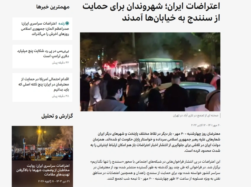 Farsca redaksiya yanvarın 13-də "İran etirazları regional mediada: Moskvanın susqunluğundan Ankaranın ittihamlarınadək" başlıqlı yazı yayımlayıb. Məqalədə bildirilib: "İranda etirazların artmasına baxmayaraq, Azərbaycanın dövlət mediası bu hadisələrlə bağlı susqunluq nümayiş etdirib. Dövlət informasiya agentliyi "AzərTag" və rəsmi "Azərbaycan" qəzeti yalnız məhdud sayda, əsasən xəbər materialları dərc edib, "Xalq" qəzeti isə bu mövzuya heç toxunmayıb".