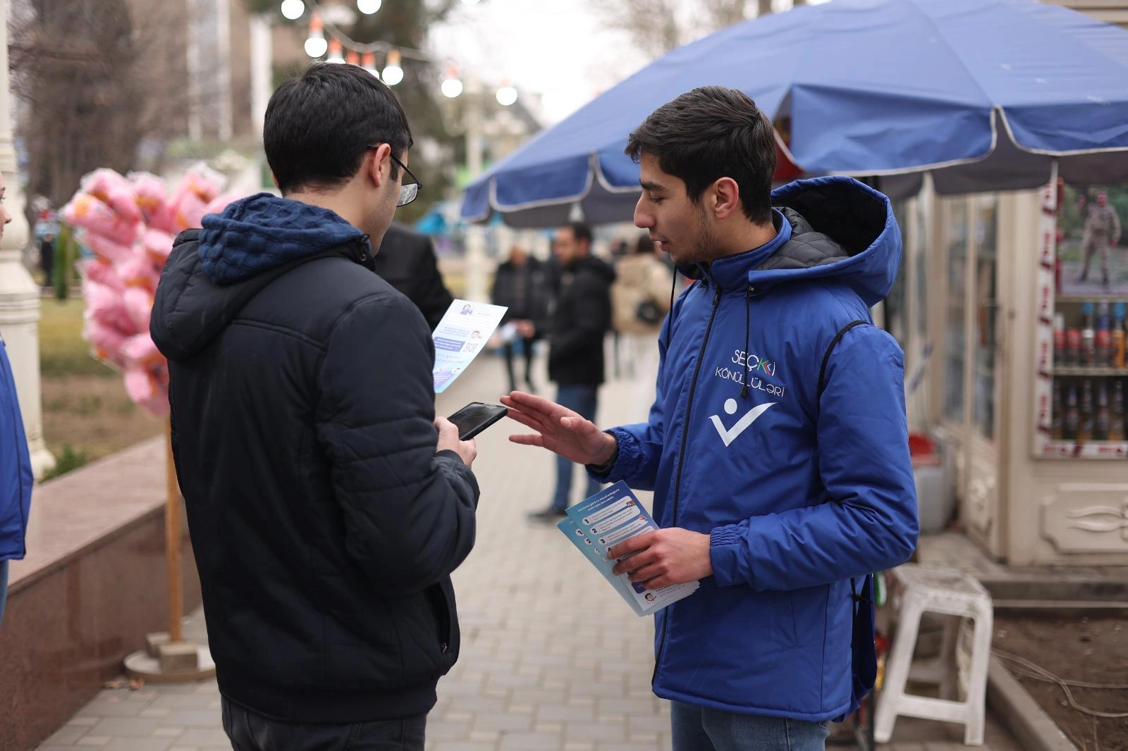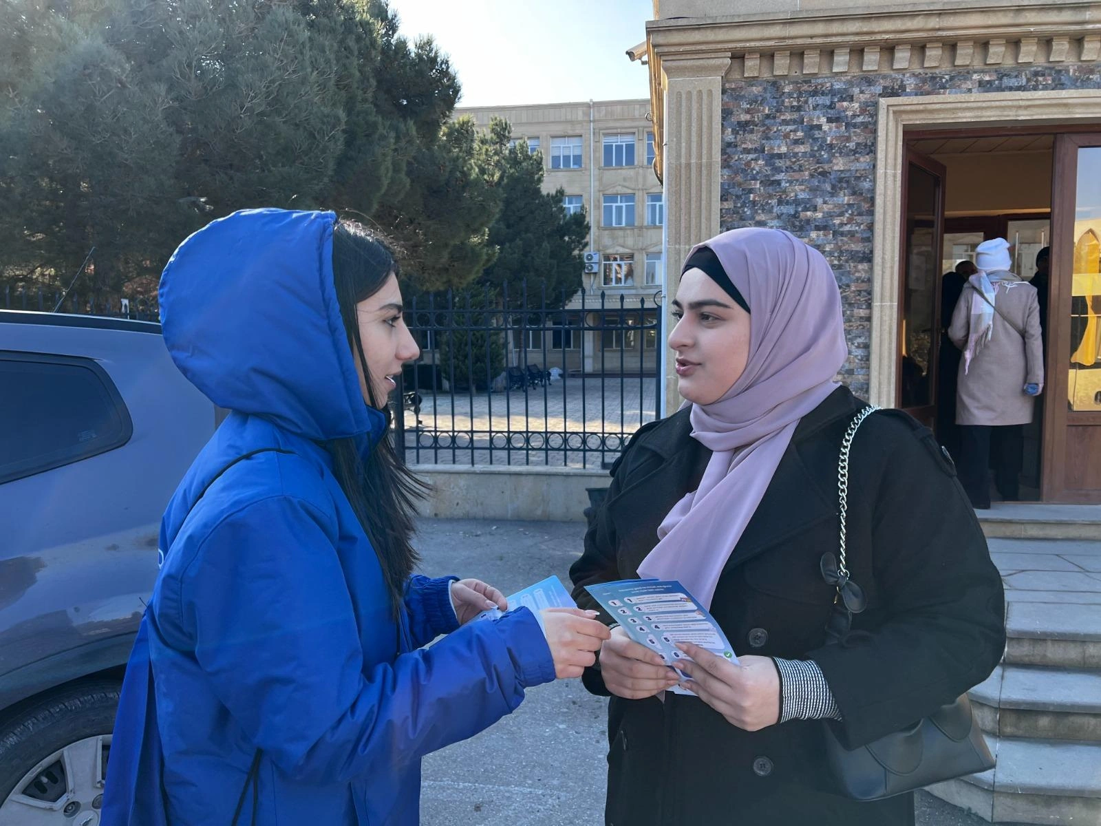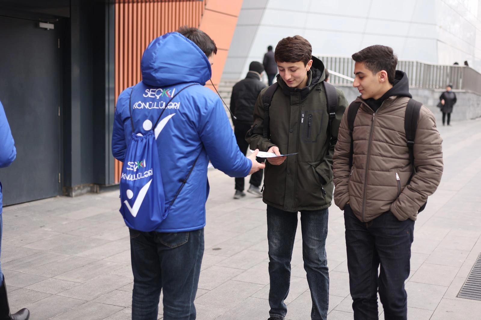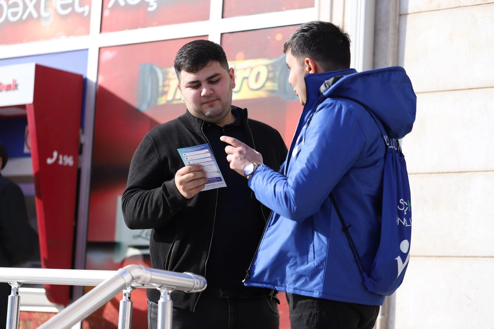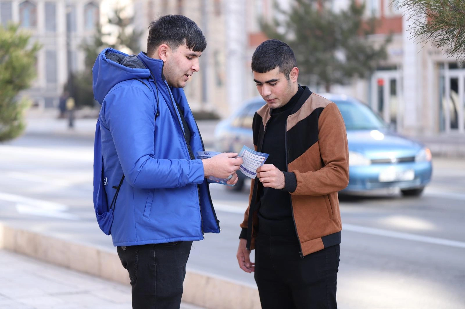 Azərbaycan Könüllü Təşkilatları İttifaqının seçki könüllüləri bölgələrdə ilk dəfə səsvermədə iştirak edəcək gənclərə seçki prosedurları ilə bağlı maarifləndirici bukletlər paylayır.