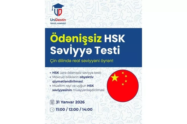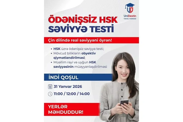 Çin dilini öyrənmək və Çin universitetlərinə qəbul almaq, həmçinin, HSK (Hanyu Shuiping Kaoshi) imtahanına hazırlaşmaq istəyənlər üçün UniDestin Təhsil Mərkəzi tərəfindən ödənişsiz HSK səviyyə testi təşkil olunur.