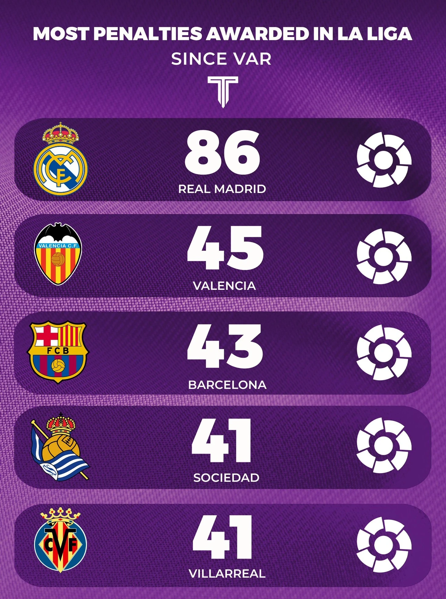 2018-ci ildə VAR-ın tətbiqindən bəri "Real" 86 penalti qazanıb ki, bu da ikinci yerdə olan "Valensiya"dan 41 penalti çoxdur.
