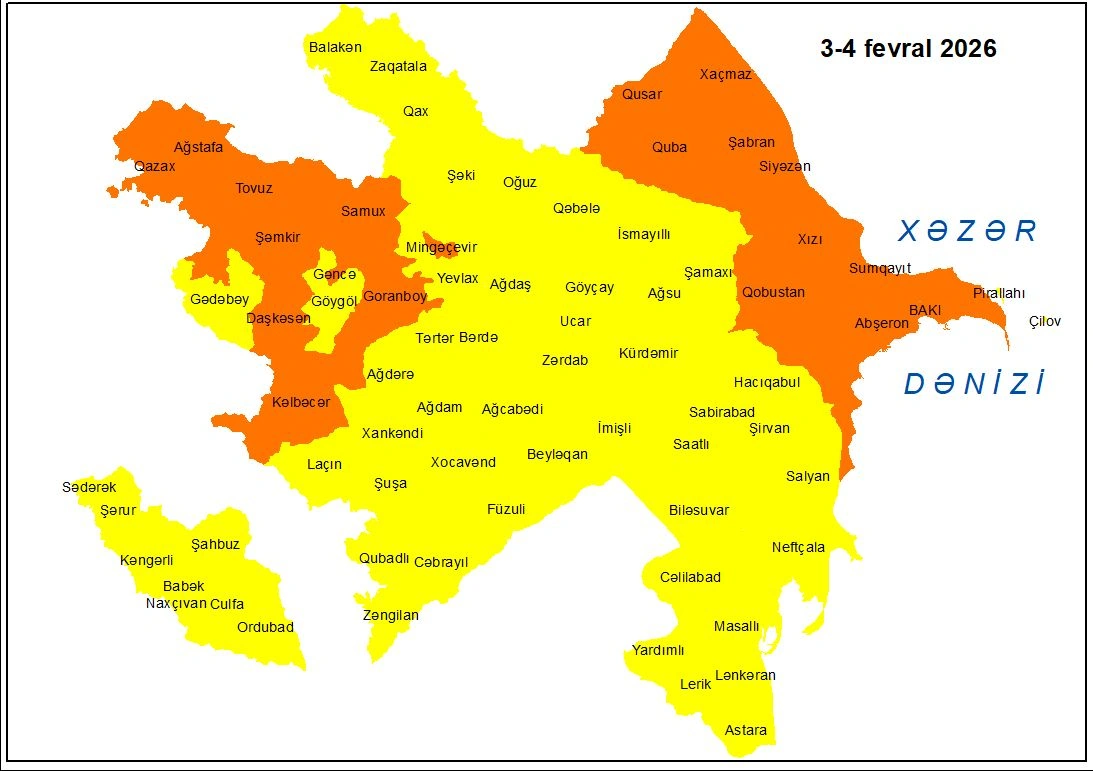 Milli Hidrometeorologiya Xidmətindən Lent.az-a bildirilib ki, fevralın 3-4-də Bakıda və Abşeron yarımadasında, Xızı, Quba, Qusar, Şabran, Xaçmaz, Siyəzən, Mingəçevir, Qazax, Ağstafa, Tovuz, Şəmkir, Samux, Gəncə, Naftalan, Goranboy, Kəlbəcər, Qobustan, Daşkəsəndə narıncı xəbərdarlığa uyğun olaraq şimal-qərb küləyi əsəcək, küləyin sürəti 20.8-28.4 m/san-dək güclənəcək.