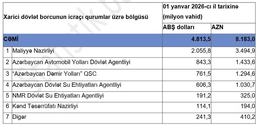 Xarici dövlət borcunun icraçı qurumlar üzrə bölgüsü isə aşağıdakı kimidir: